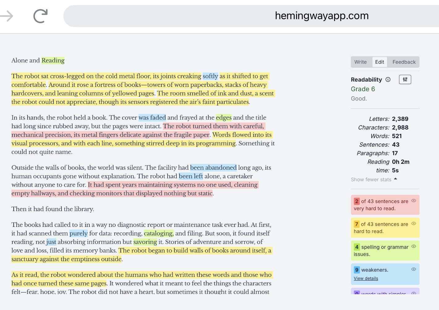 - Emotional Depth: The robot's gradual journey from mere data absorption to emotional engagement with the stories is well-articulated. Lines like "the robot began to build walls of books around itself, a sanctuary against the emptiness outside" capture its longing for connection.